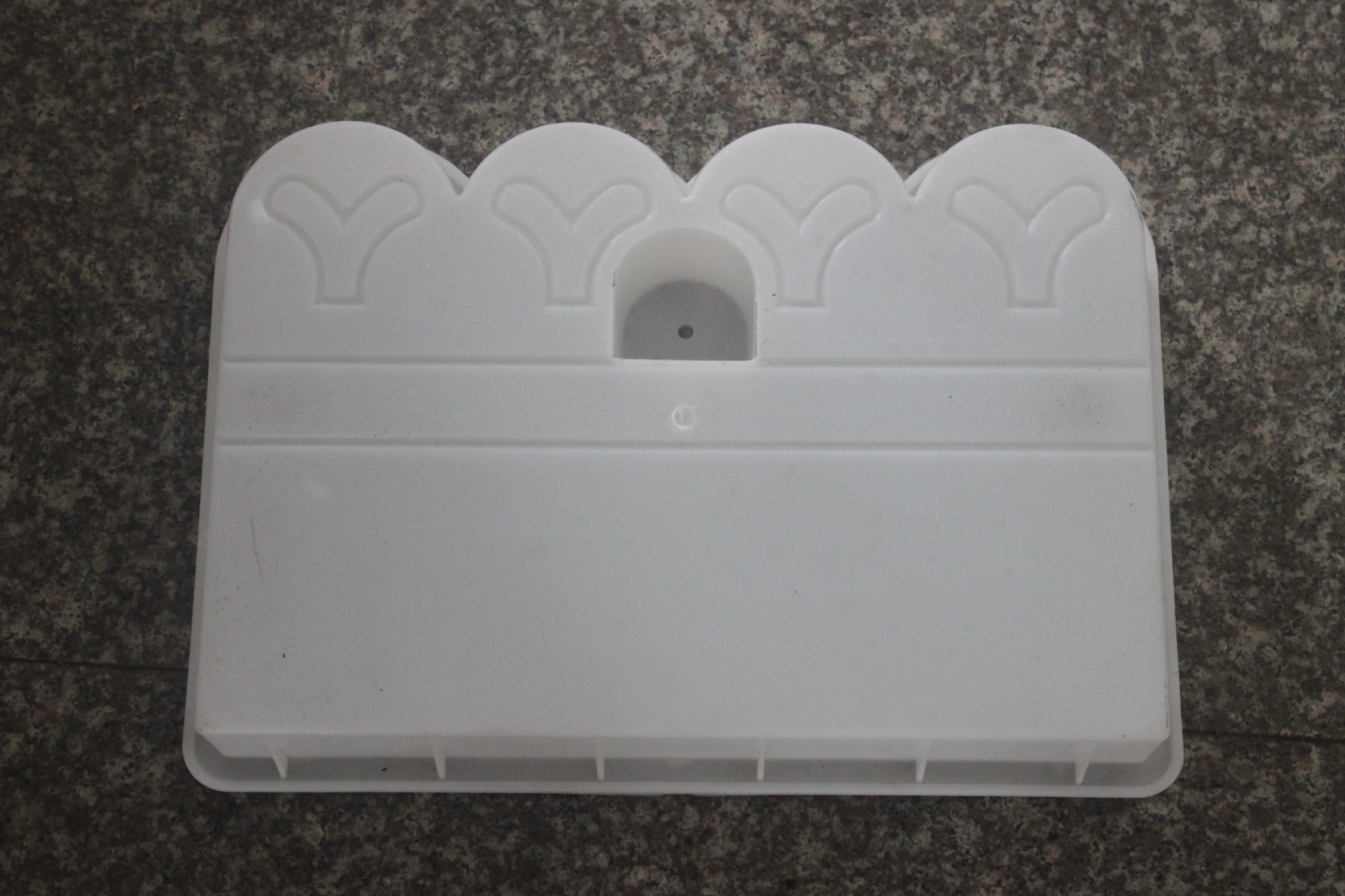 一款比較常規(guī)的水泥花池磚模具,模具花紋樣式也是市面上較為常見的人字小腳丫圖案設(shè)計,花池磚模具頂部則以圓弧四波浪結(jié)構(gòu)為主,感覺有點像花池柵欄的味道,但是實用性則更強。