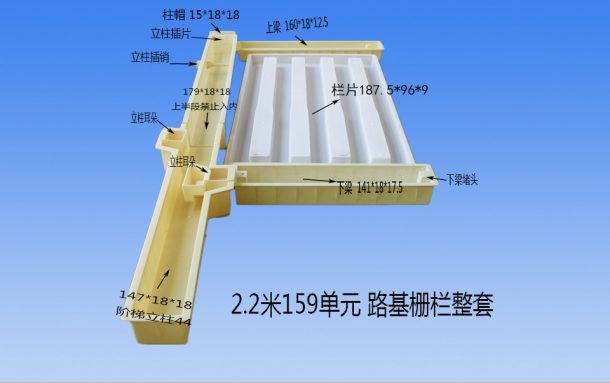 2.路基護(hù)欄塑料模具上下梁尺寸:上梁為160*18*125CM,下梁為141*18*17.5CM,陪有下梁堵頭。