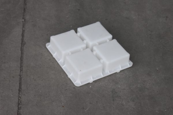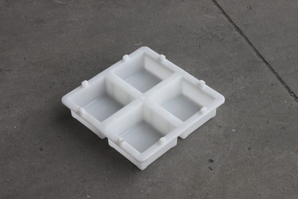 一脫四整體結(jié)構(gòu)的水泥磚模具,全新聚丙烯塑料材質(zhì),采用臥式注塑機(jī)半固定式注塑模具,單型腔熱流注塑成型。水泥磚塑料模具整體尺寸為22*22CM正方形結(jié)構(gòu)設(shè)計(jì),共分為4個10*10*5的水泥磚脫??臻g。