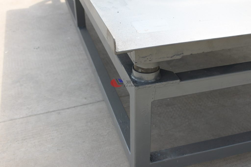對(duì)于尺寸規(guī)格較大的水泥制品模具,在澆筑過(guò)程中不方便將模具內(nèi)的空氣,以及混凝土在模具中的均勻攤平,通過(guò)使用振動(dòng)臺(tái)來(lái)將內(nèi)部空氣排放和混凝土的振實(shí)。振動(dòng)臺(tái)四個(gè)臺(tái)腳處都設(shè)計(jì)上了墊腳,在震動(dòng)過(guò)程中能保持平衡。