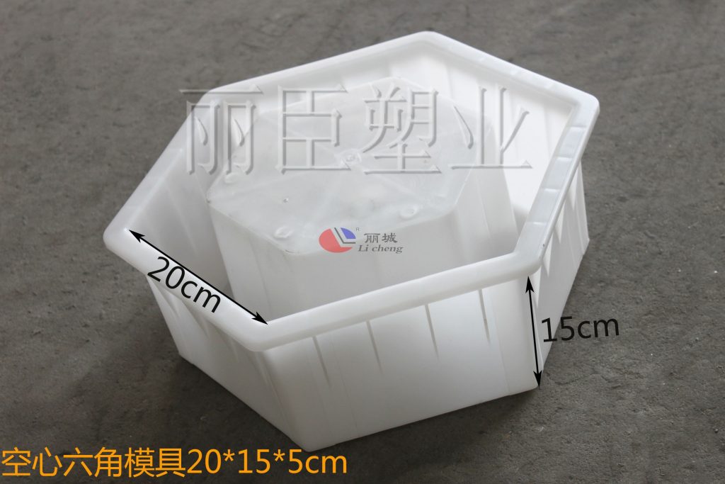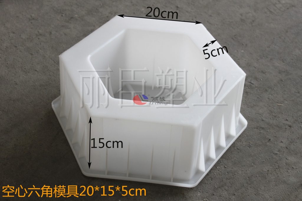 空心六角塑料模具在設計上采用PP聚丙烯塑料注塑而成,這款六角護坡模具的尺寸為20x15x5cm,5cm的壁厚對于后期澆筑成型水泥制品,在安裝使用上能更為簡便。