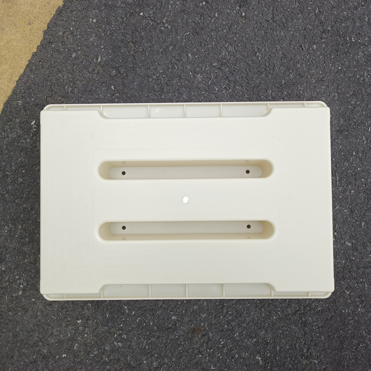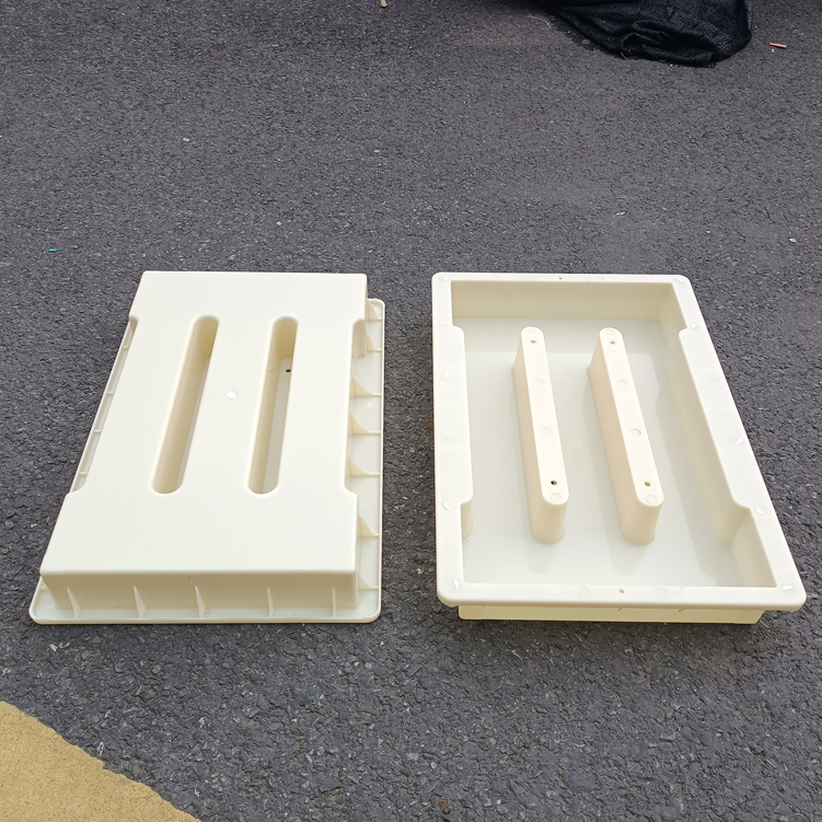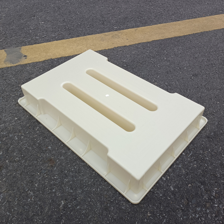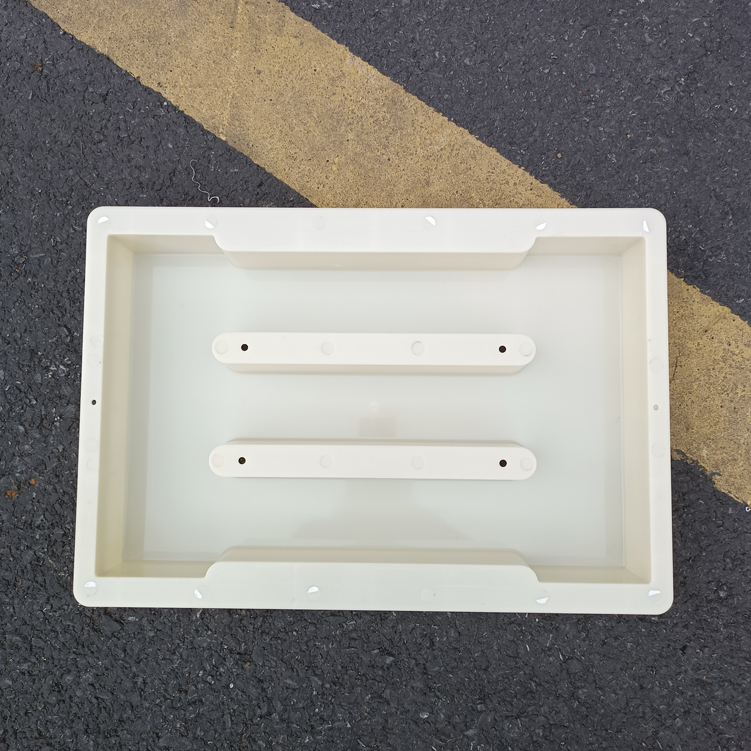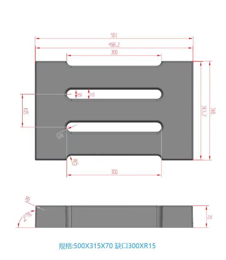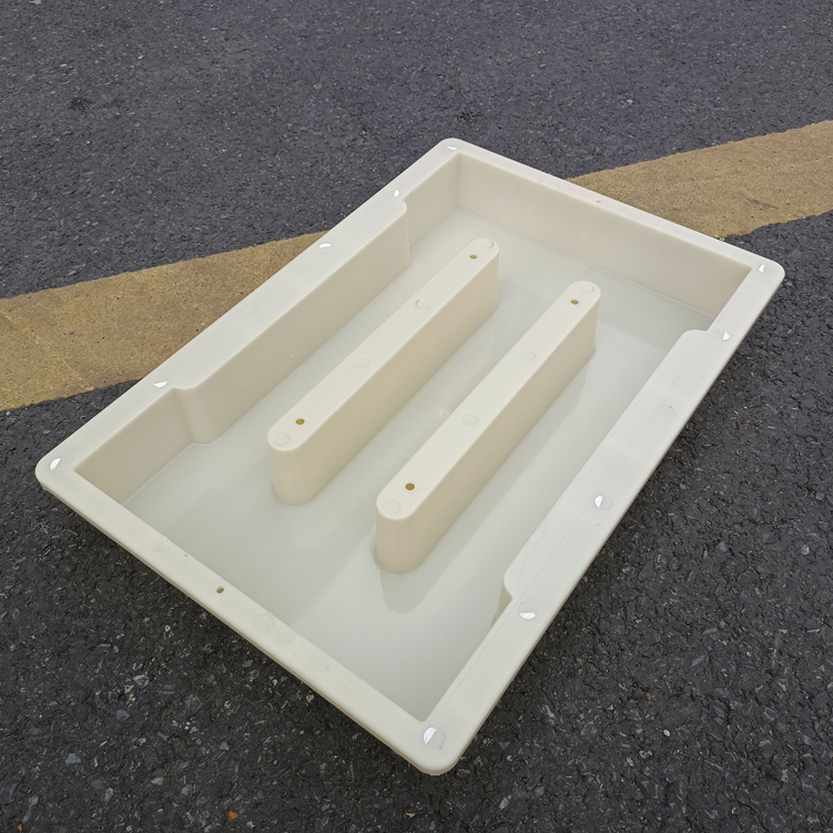 模具整體材質采用強度較高的淺黃色ABS材質制成、模具帶缺口二孔,大體尺寸為50cm*31.5cm*7cm,具體尺寸如下設計圖,模具材質強度高,可以重復使用多次,擁有缺口的設計可以使雨水流通量更大,更不容易造成堵塞。